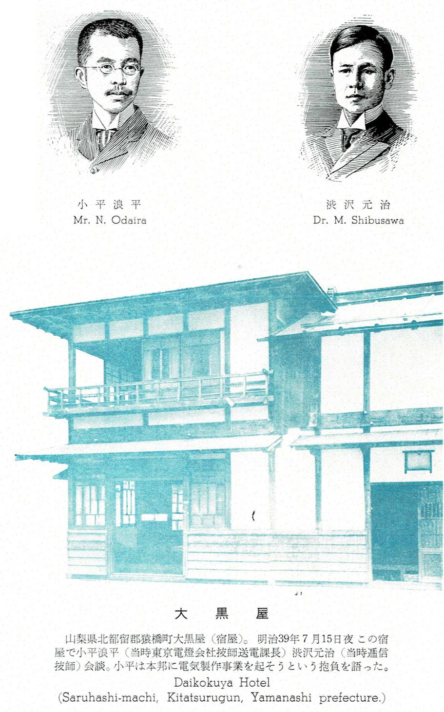 明治39年7月15日、猿橋橋畔の大黒屋旅館に、当時東京電燈(現東京電力)の技術者小平浪平と逓信省の逓信技師の渋沢元治が会談、我国に電気製作事業を起こそうと語り合った。