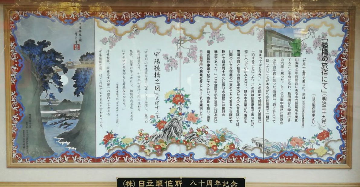 明治39年(1906)、猿橋橋畔の大黒屋旅館で、大学時代の旧友である渋沢元治と、夜を徹して語り合い、外国製品と技術者の手によるものではなく、国産技術で作れるようにしないといけないと、決意した事が後の日立製作所の創業につながった。
