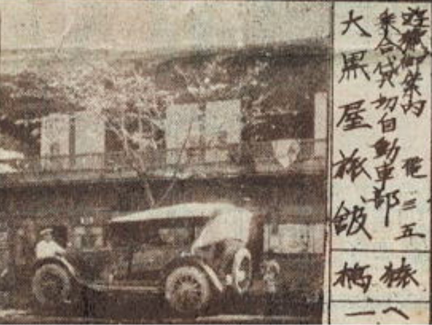 大正7年絵地図の公告写真 当時めずらしい自動車での送迎を行っていあう。